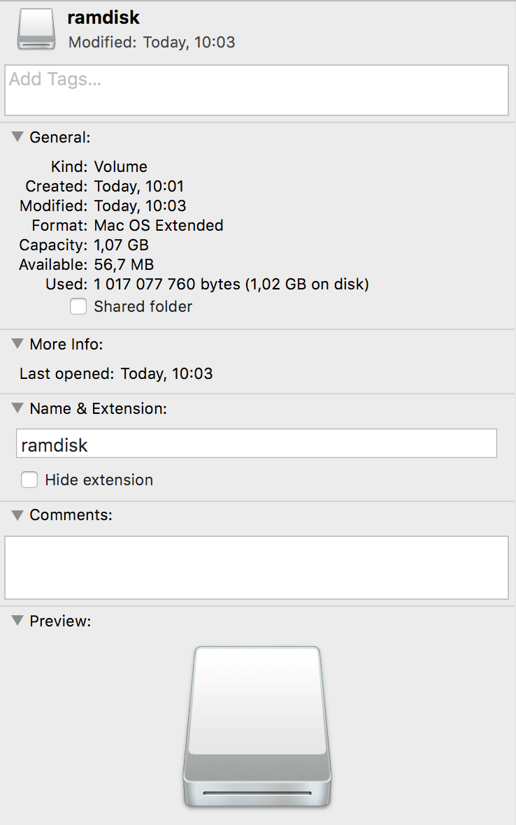 之后你会发现你会多出一个叫 ramdisk 的内存空间,有大概 1 GB 大小。