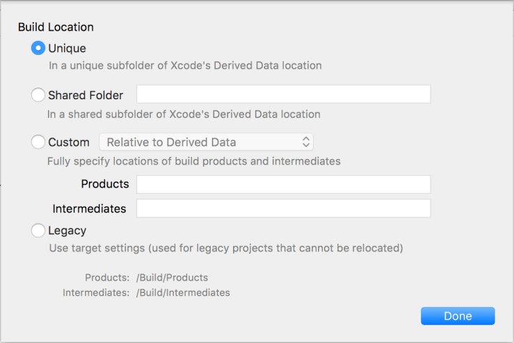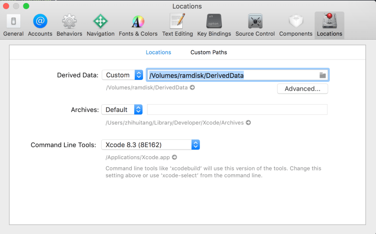 第三步,连接 Xcode。Xcode -> Preferences -> Locations -> Locations Tab,配置 DerivedData。