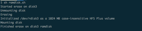 diskutil erasevolume HFS+ $RAMDISK `hdiutil attach -nomount ram://$[SIZE*2048]`