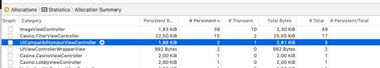 The two columns worth noting in Instruments are # Persistent and # Transient. The Persistent column keeps a count of the number of objects of each type that currently exist in memory. The Transient column shows the number of objects that have existed but have since been deallocated. Persistent objects are using up memory, transient objects have had their memory released.